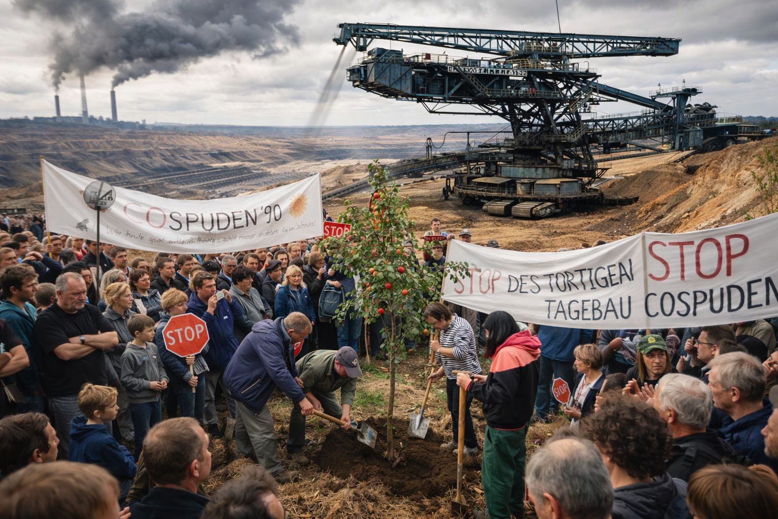 Ermutigt von den vorangegangenen Demos in Leipzigs Zentrum demonstrierten Zehntausende direkt vor Ort am Tagebau Cospuden gegen die Fortsetzung einer umweltzerstörerischen Energiepolitik und erhoben ihre Stimme gegen das Dröhnen der noch immer arbeitenden Förderbrücken. Symbolisch pflanzte man einen Baum an der Tagebaukante. Mit diesem Zeichen setzen die Menschen auf Vernunft und Hoffnung für eine saubere Umwelt.